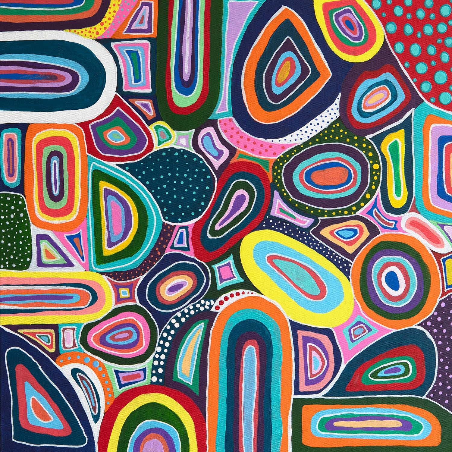'Color Squish' is a limited edition reproduction of an abstract painting by Elaine Van Wyk.  This painting was a lot of fun to paint.  It is done in a very loose folk art style.  The colors all squish together in a crowded by happy pattern.
