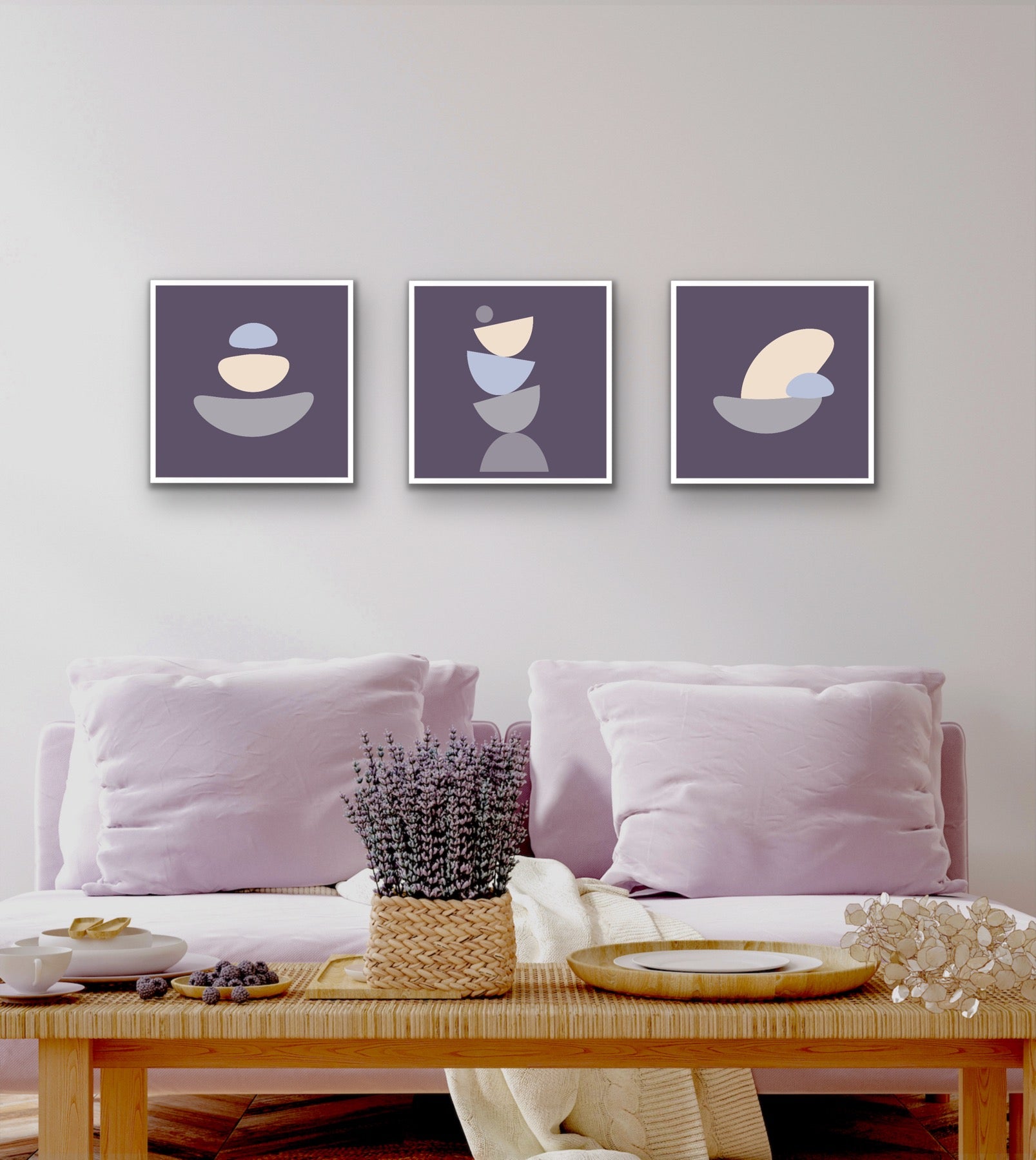 Four white framed Symphony of shapes posters displayed in a grid in a modern home.